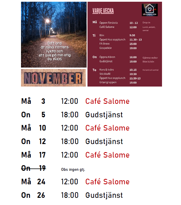 Du hittar veckoprogram under "program" och kan också se i kalendern vad som är aktuellt. Vi finns också på Facebook.