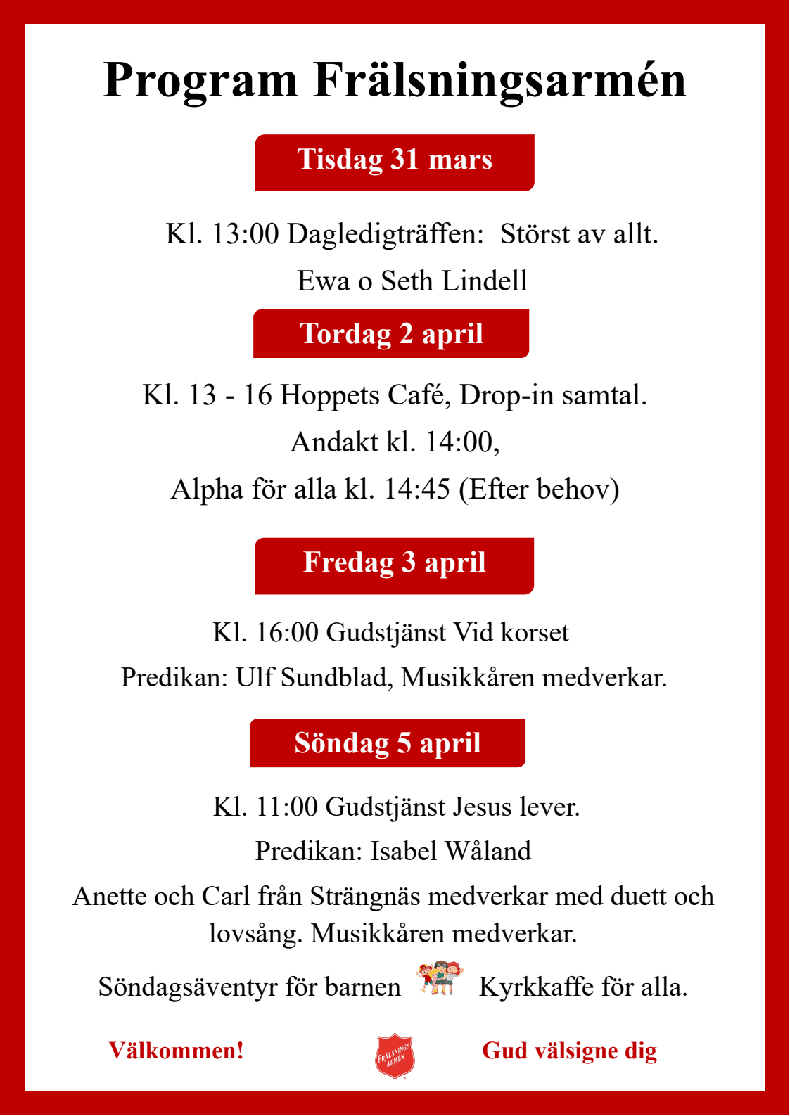 För barn och ungdomar har vi olika aktiviteter, som fredagshäng, ungdomssamling och scouting med mera. För äldre personer har vi också välbesökta aktiviteter på dagtid. Vi har även ett aktivt brassband. I alla våra samlingar och i vår gemenskap tron på Jesus central. Ett bra sätt att närma sig kristen tro, pröva på eller att fördjupa sig, är att gå en alphakurs eller på bibelstudier.