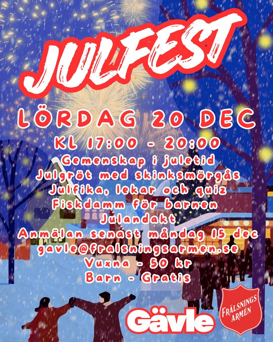 Jul i gemenskap. Kårens julfest. Julgröt och skinksmörgås. Julfika. Lekar. Quiz. Fiskdamm för barnen. Julandakt. Anmälan SENAST 15 dec. (50kr vuxen, barn gratis)