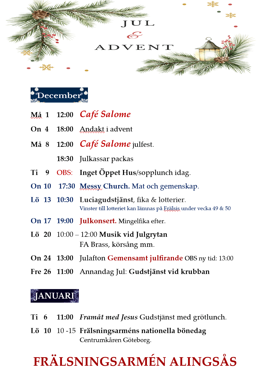 Frälsningsarmén i Alingsås vill vara en gemenskap med Jesus i centrum. Vårt uppdrag är att förkunna budskapet om Jesus Kristus och att utan att göra skillnad på människor möta behov i hans namn.