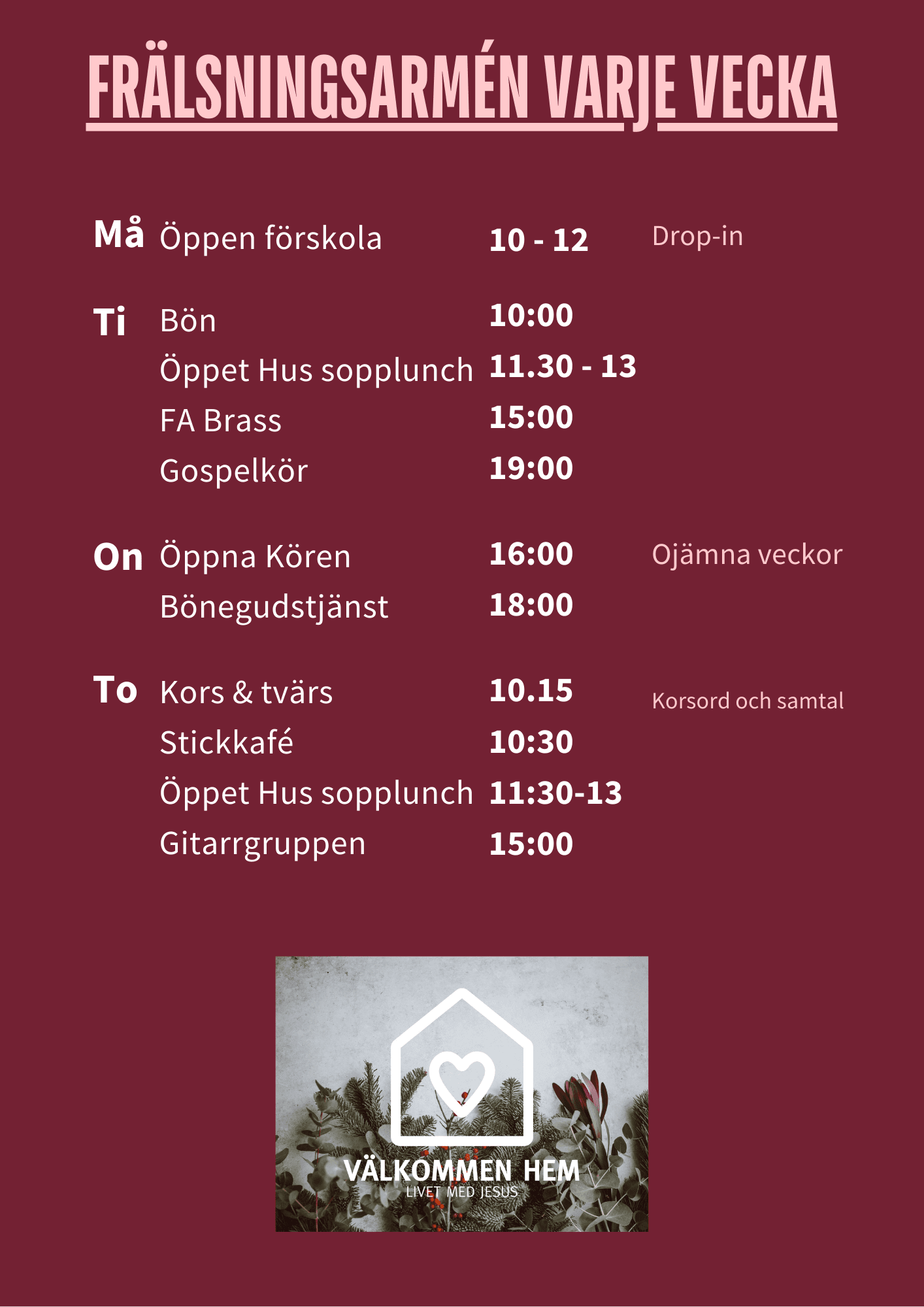 Alla samlingar är på Frälsningsarmén, Torgatan 1, i Alingsås om inte annat anges.