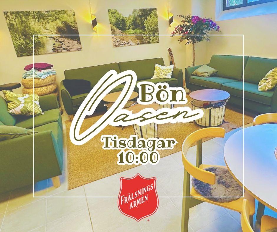 Bönelivet är något oerhört dyrbart. Genom bönen får vi vara med och lyfta människor, situationer och platser inför vår Herre. På tisdagar kl 10:00-11:00 så samlas vi till bön nere i Oasen. Efter bönen så finns det möjlighet att stanna kvar och fika, eller ta med en egen lunchlåda och sitta kvar och umgås.