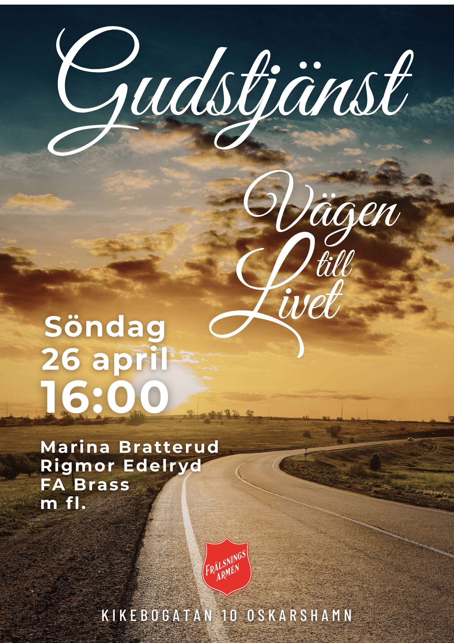Välkommen till Gudstjänst"Vägen till Livet"Söndag 26 april kl 16:00Marina Bratterud, Rigmor Edelryd, FA Brass, m fl