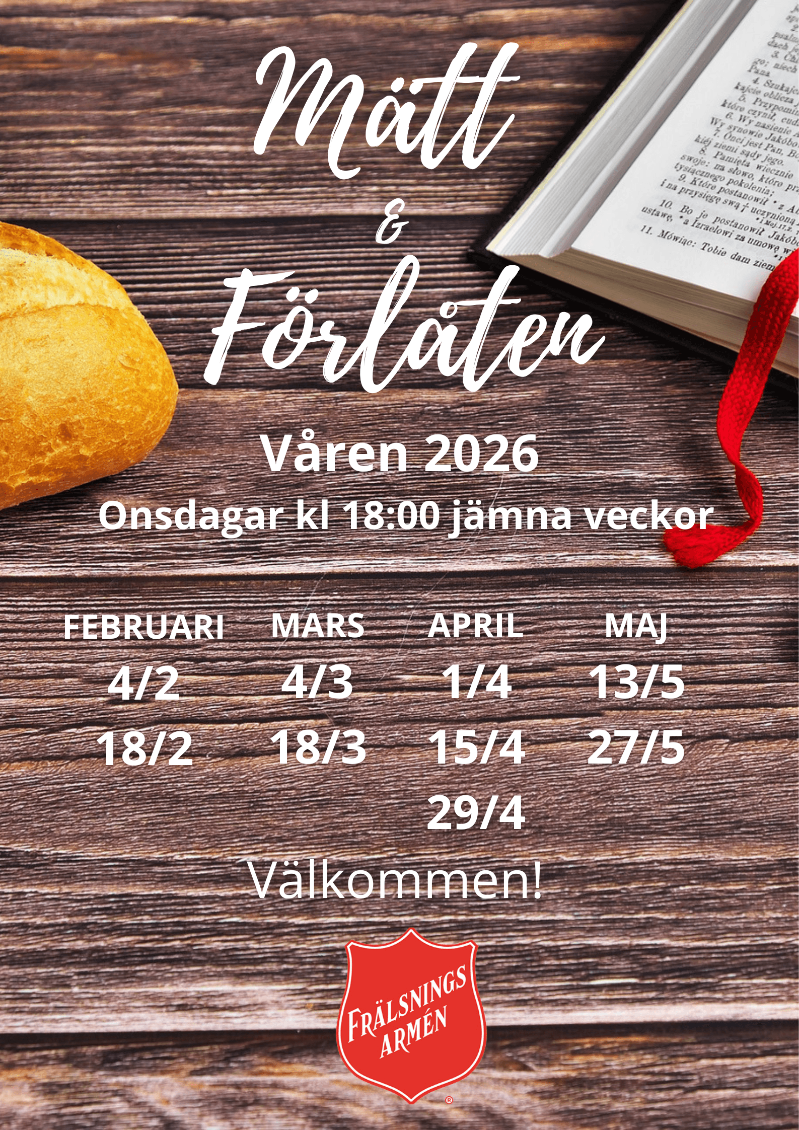 Onsdagar jämna veckor kl 18:00-20:00 äter vi kvällsmat tillsammans och samtalar om livet utifrån Bibelordet.
