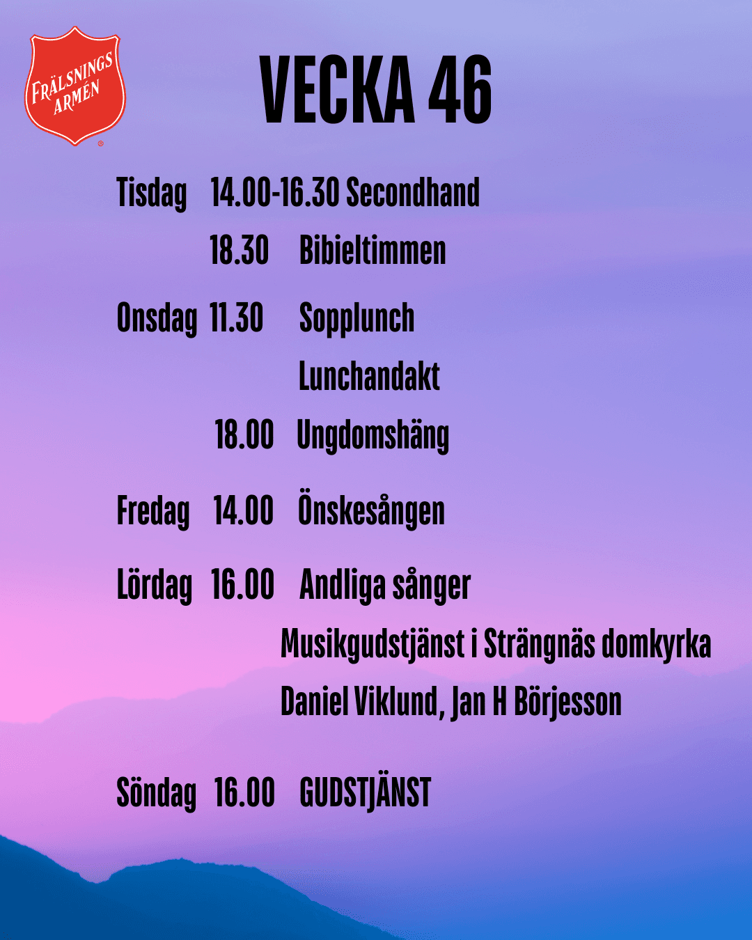 Daniel Viklund är pastor och kårledare på Frälsningsarmén i Strängnäs. Anette Palmquist är Omsorgskonsulent och finns tillgänglig när det gäller samtal om ekonomiskt stöd och andra typer av hjälpinsatser.